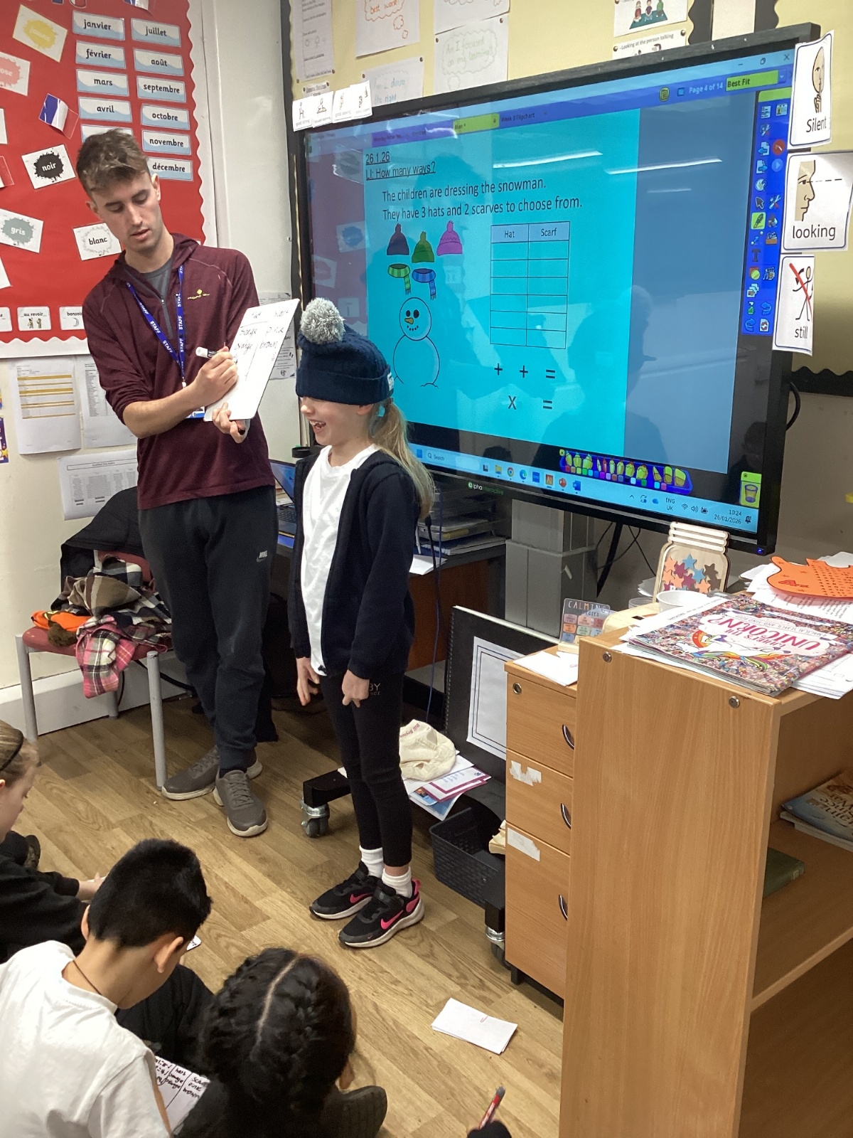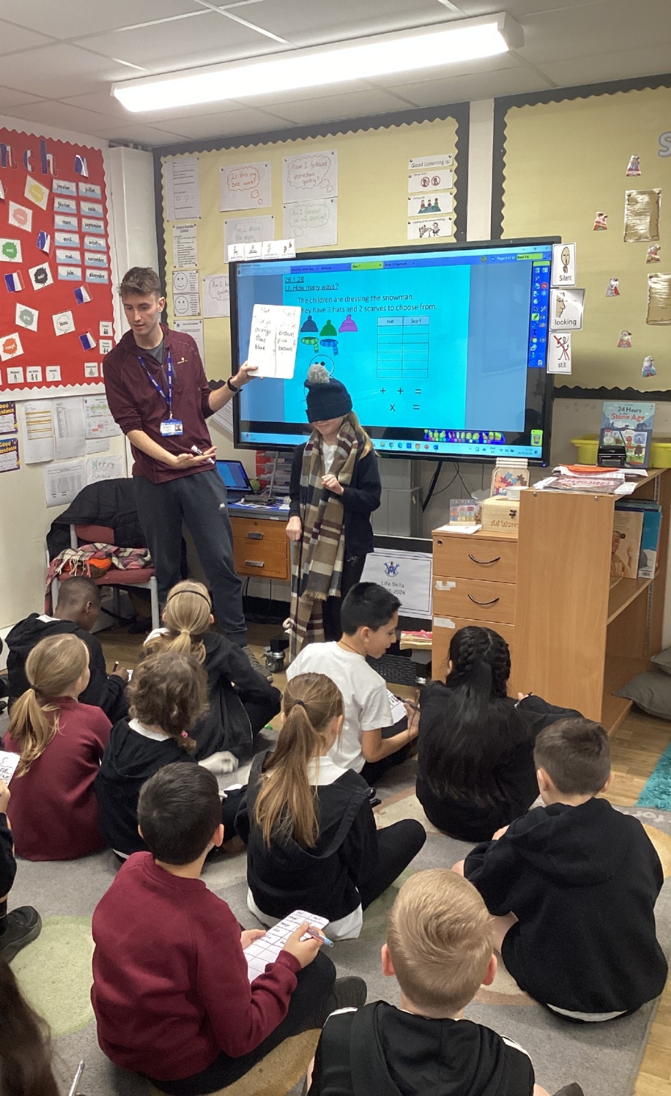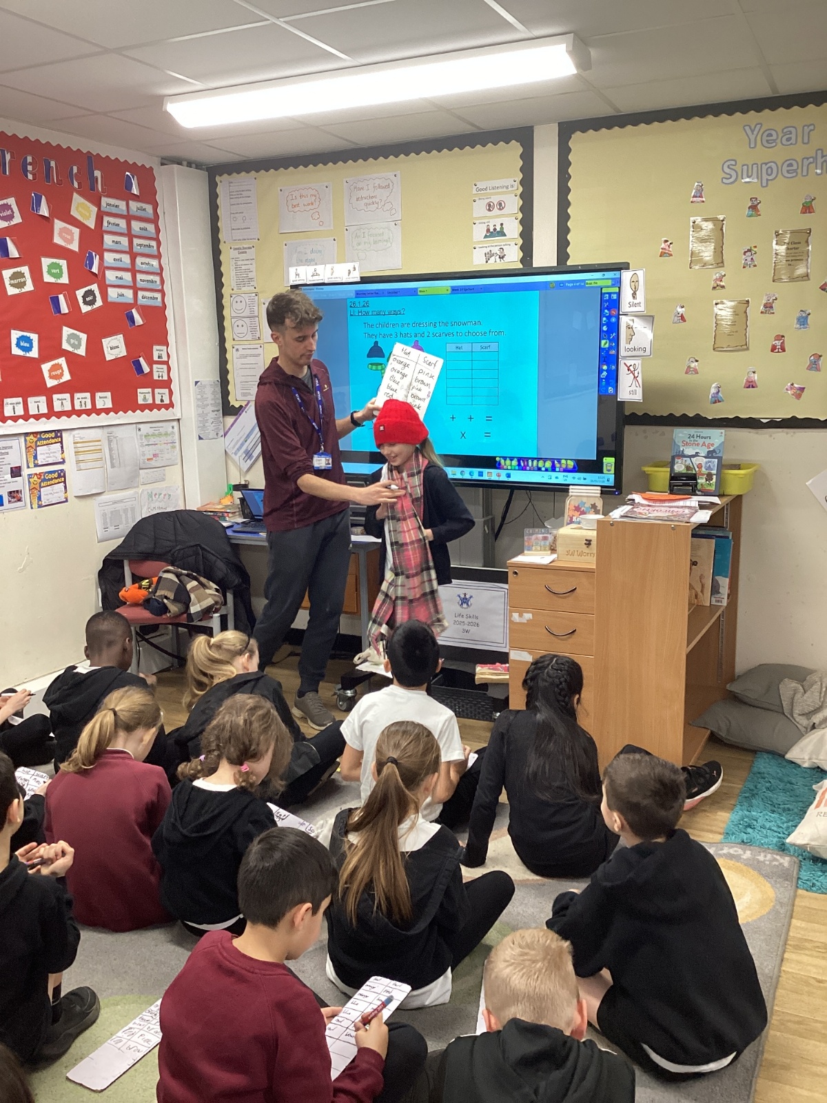 In maths, we have learnt to calculate how many ways or combinations something could have. Here we are testing how many ways we could wear different combinations of hats and scarfs.